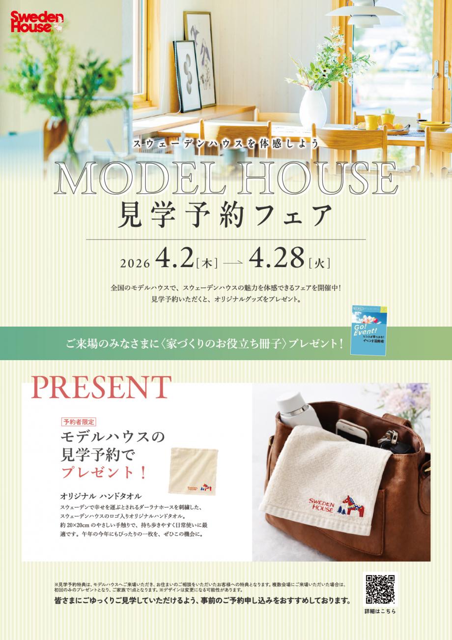 4/2~4/28に【見学予約フェア】を開催中!モデルハウスに見学予約をいただいた方には【オリジナルハンドタオル】をプレゼント!ご来場お待ちしております!※ご来場予約特典はモデルハウスへご来場いただき、お住まいのご相談をいただいたお客様への特典となります。※複数会場にご来場いただいた場合は、初回のみのプレゼントとなり、ご家族で1点となります。